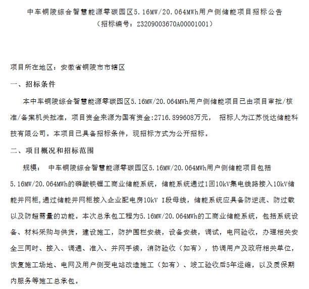 限价1.354元/Wh!悦达储能安徽铜陵5.16MW/20.064MWh用户侧储能EPC招标
