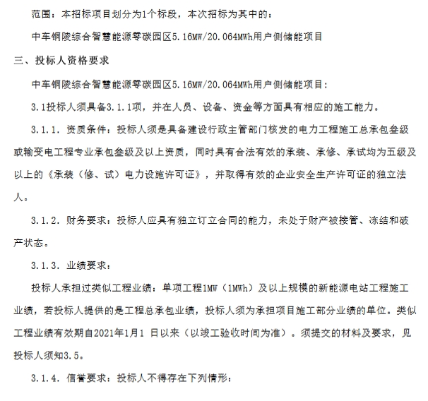 本次总承包工程为5.16MW/20.064MWh的工商业储能系统,包括系统设备、材料采购与供货,建设施工,防护围栏安装,设备安装,调试,电网验收,办理相关安全三同时、接入、调通、准入、并网手续,消防验收(如有),协调用户及政府相关单位,恢复施工场地、电网及用户侧变电站改造施工(如有)、竣工验收后5年运维,以及质保期内服务等施工总承包。