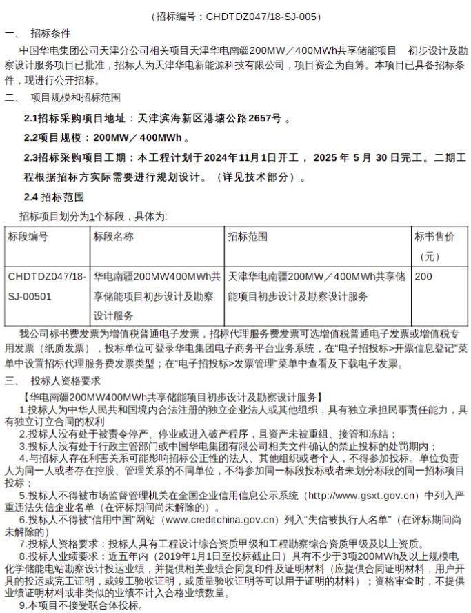 天津华电南疆200MW/400MWh共享储能项目初步设计及勘察设计服务招标公告
