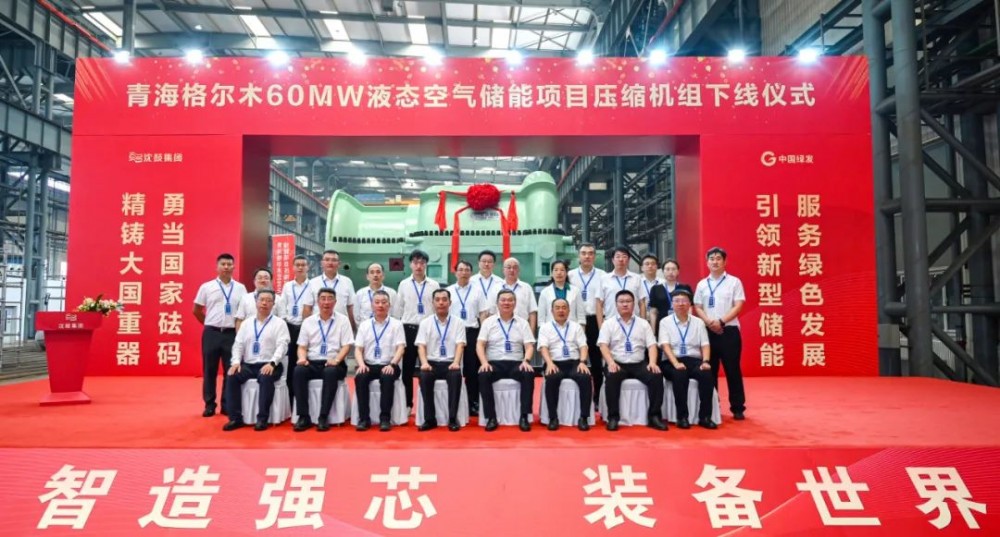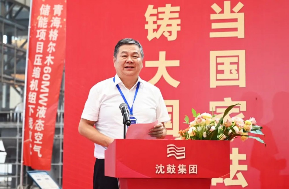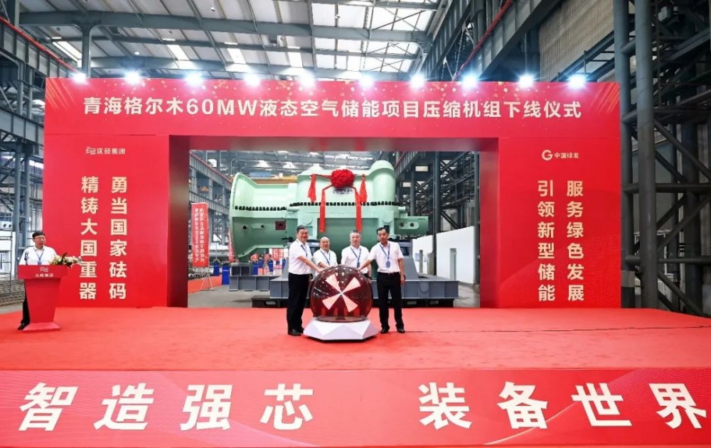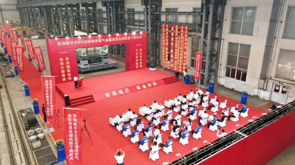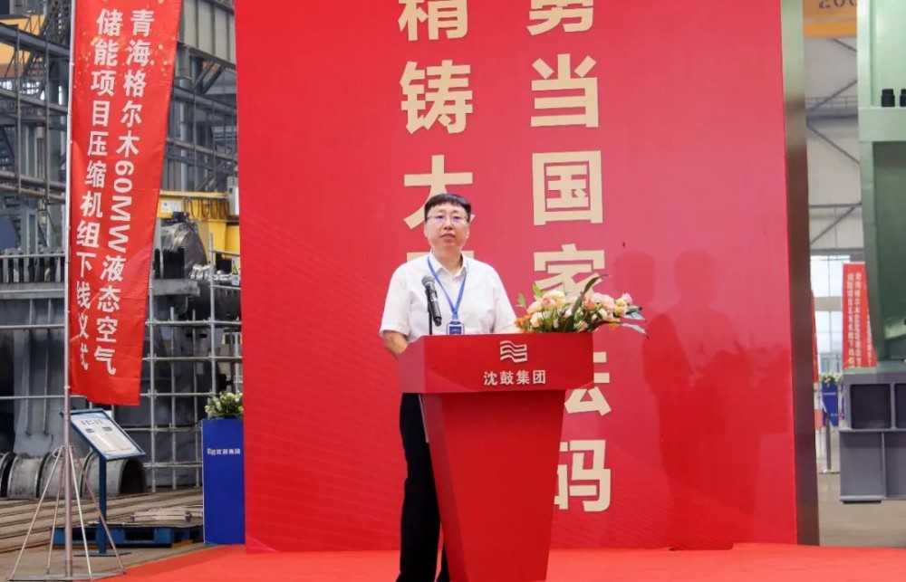 8月17日上午,青海格尔木60MW液态空气储能示范项目压缩机组下线仪式在沈鼓集团营口透平厂区总装车间举行。辽宁省营口市鲅鱼圈区委书记孟鑫,区长管尊旭,中国绿发青海分公司董事长强同波,中绿中科储能技术有限公司董事长王新东,沈鼓集团总裁、党委副书记马诚等领导嘉宾出席下线仪式,下线仪式由沈鼓集团副总裁、首席营销官马志宏主持。