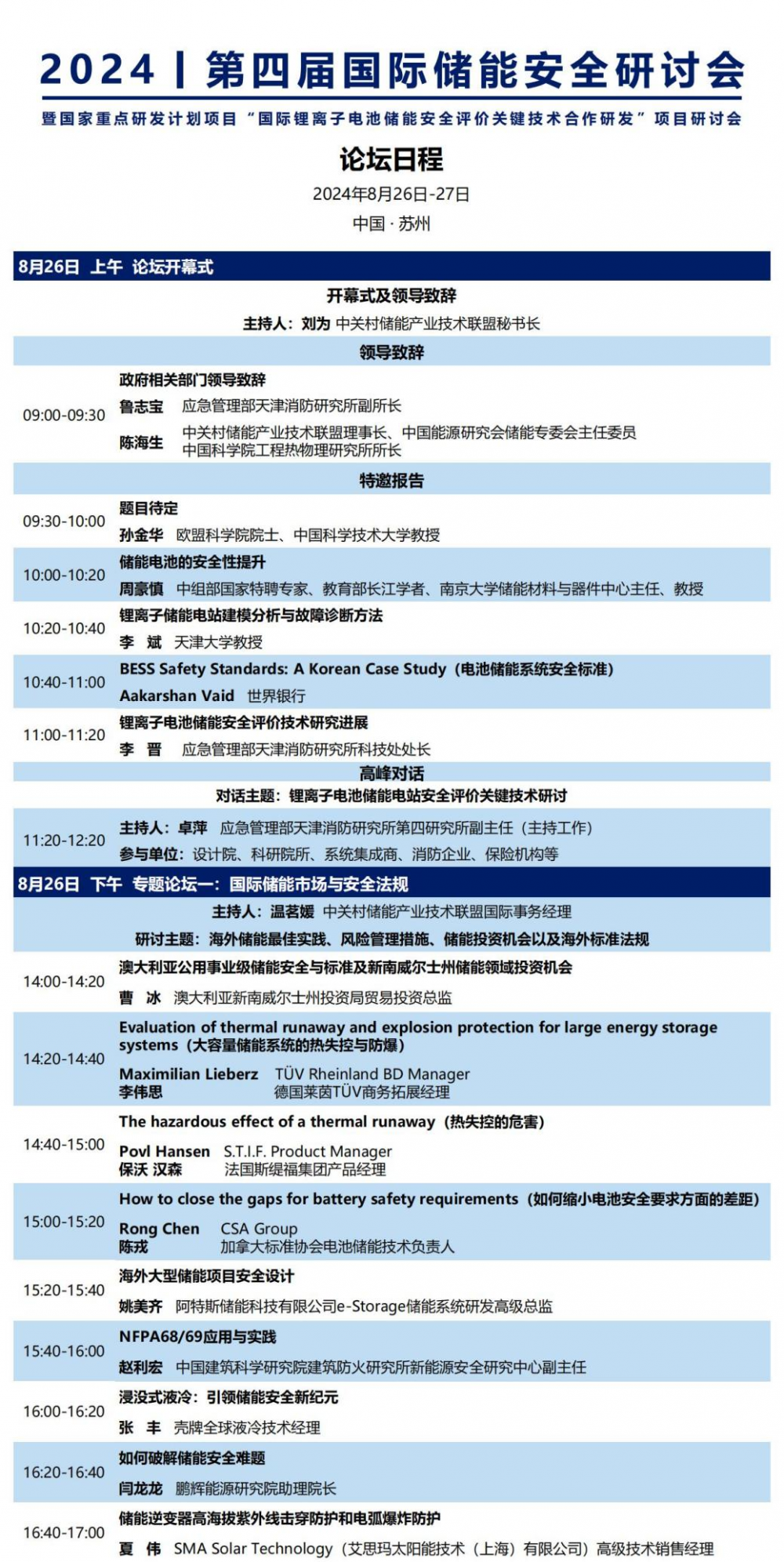 为进一步推动储能产业高质量发展,严守储能产业安全底线,中关村储能产业技术联盟、应急管理部天津消防研究所拟定于2024年8月在江苏举办联合主办“第四届国际储能安全研讨会”。本次论坛将邀请国内外储能安全相关科研院所、电网、发电集团、设计院、集成商、消防技术厂家以及政府相关主管部门等,针对储能项目建设、储能系统、储能电池、消防措施以及应急管理等安全相关问题开展深入交流。