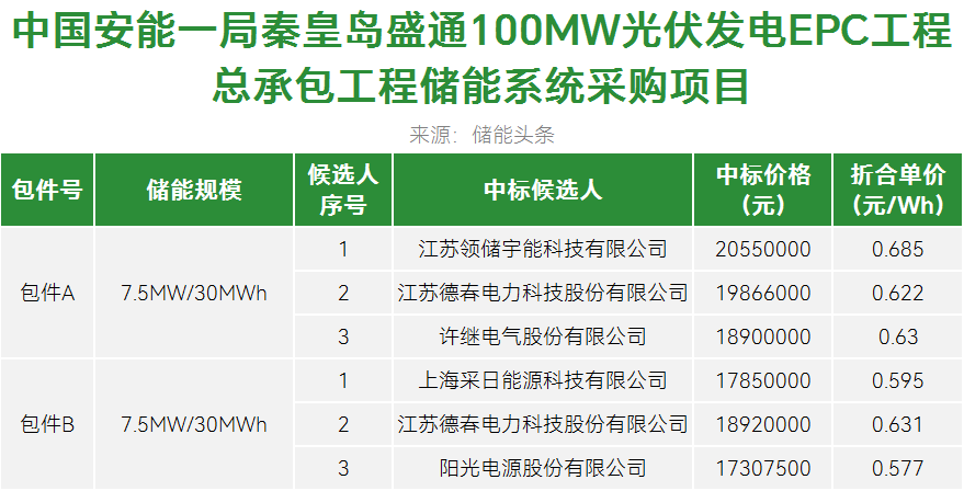 第一中标候选人为上海采日能源科技有限公司,中标价格17850000元,折合单价0.595元/Wh;第二中标候选人为江苏德春电力科技股份有限公司,中标价格18920000元,折合单价0.631元/Wh;第三中标候选人为阳光电源股份有限公司,中标价格17307500元,折合单价0.577元/Wh。