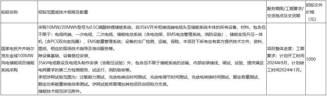 8月22日,国家电投集团黑龙江电力有限公司启动国家电投齐齐哈尔克东金城100MW风电储能项目储能系统采购,项目业主为克东县绿智新能源有限公司。采购需求为采购10MW/20MWh型号为0.5C磷酸铁锂储能系统,自35kV开关柜接线端电缆头至储能系统本体的所有设备、材料,包含但不限于:电缆终端、一次电缆、二次电缆、储能电池系统(含电池架、BMS电池管理系统、消防设施)、储能变流升压一体机(含PCS双向变流器)、EMS能量管理系统;设备的出厂检测、运输、保险,本项目下所有应有卖方提供技术文件、资料、图纸,相应的现场技术指导及培训服务等。
