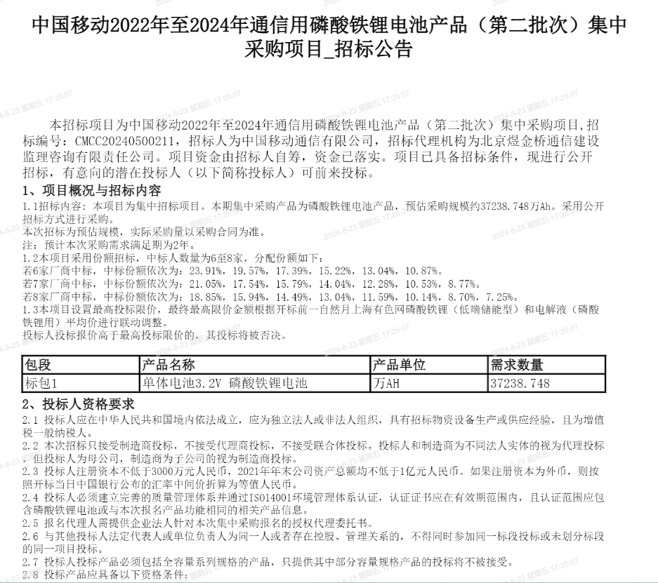 根据统计,8月23日,中国移动发布2022年至2024年通信用磷酸铁锂电池产品(第二批次)集中采购项目招标公告,本次预估采购规模为3.2V单体电池37238.748万Ah,合计总容量约1.19GWh。拟定中标企业6到8家。投标人本次所投的磷酸铁锂电池产品自2019年1月1日至2022年6月30日期间在中华人民共和国境内销售业绩累计不低于5000万元人民币。投标人之间的销售业绩不纳入统计范围。