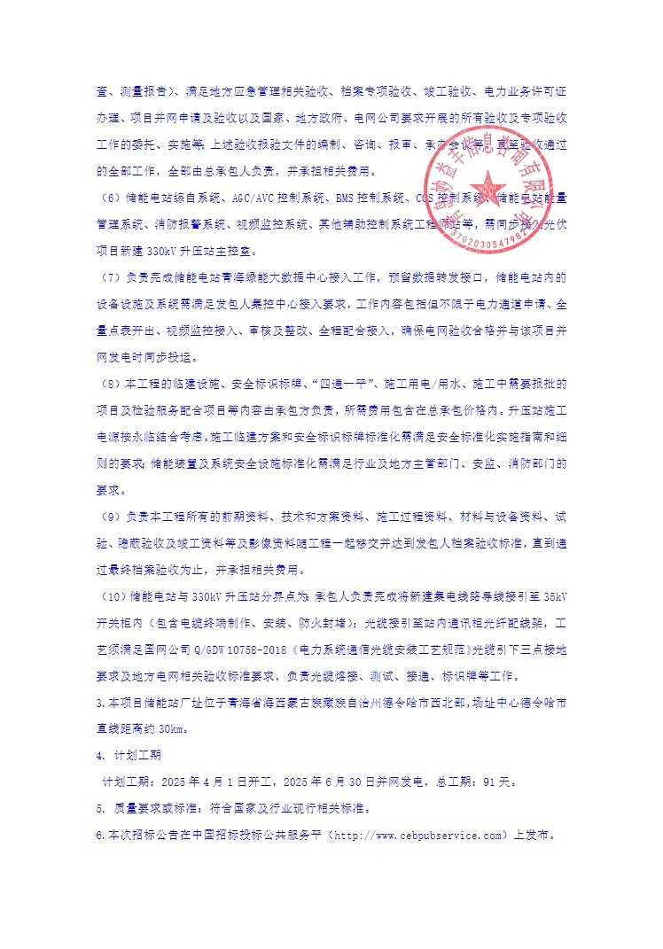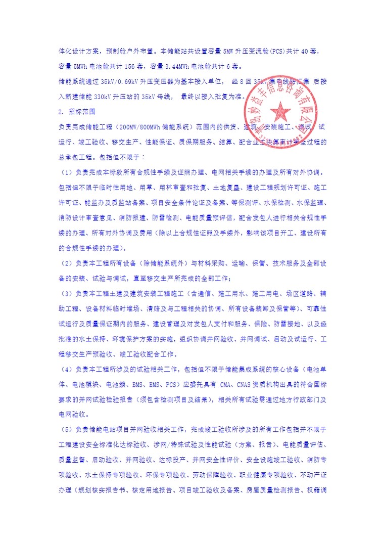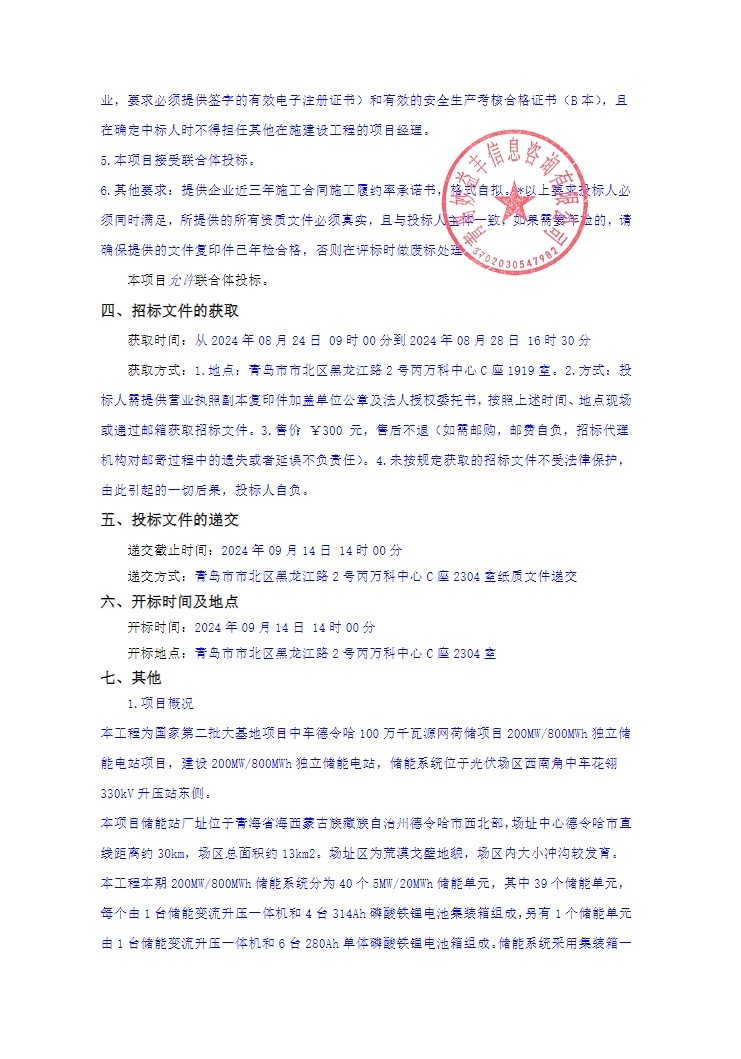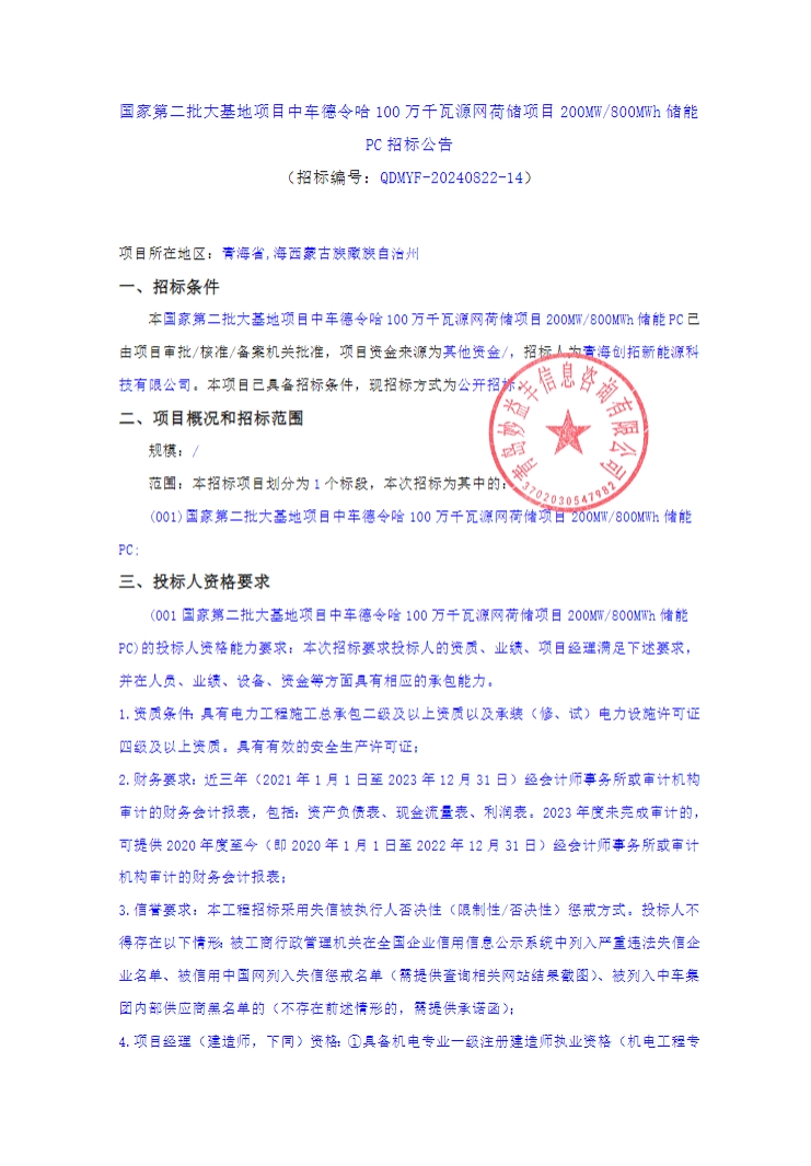 8月24日,国家第二批大基地项目中车德令哈100万千瓦源网荷储项目200MW/800MWh独立储能电站开启PC招标。