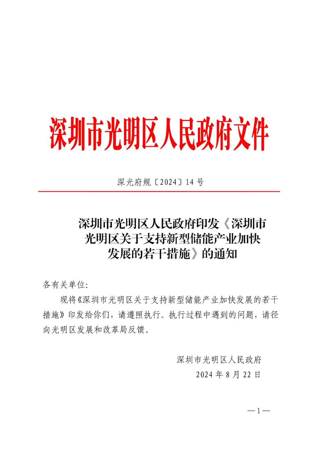 获悉,8月26日,深圳市光明区人民政府印发《深圳市光明区关于支持新型储能产业加快发展的若干措施》。
