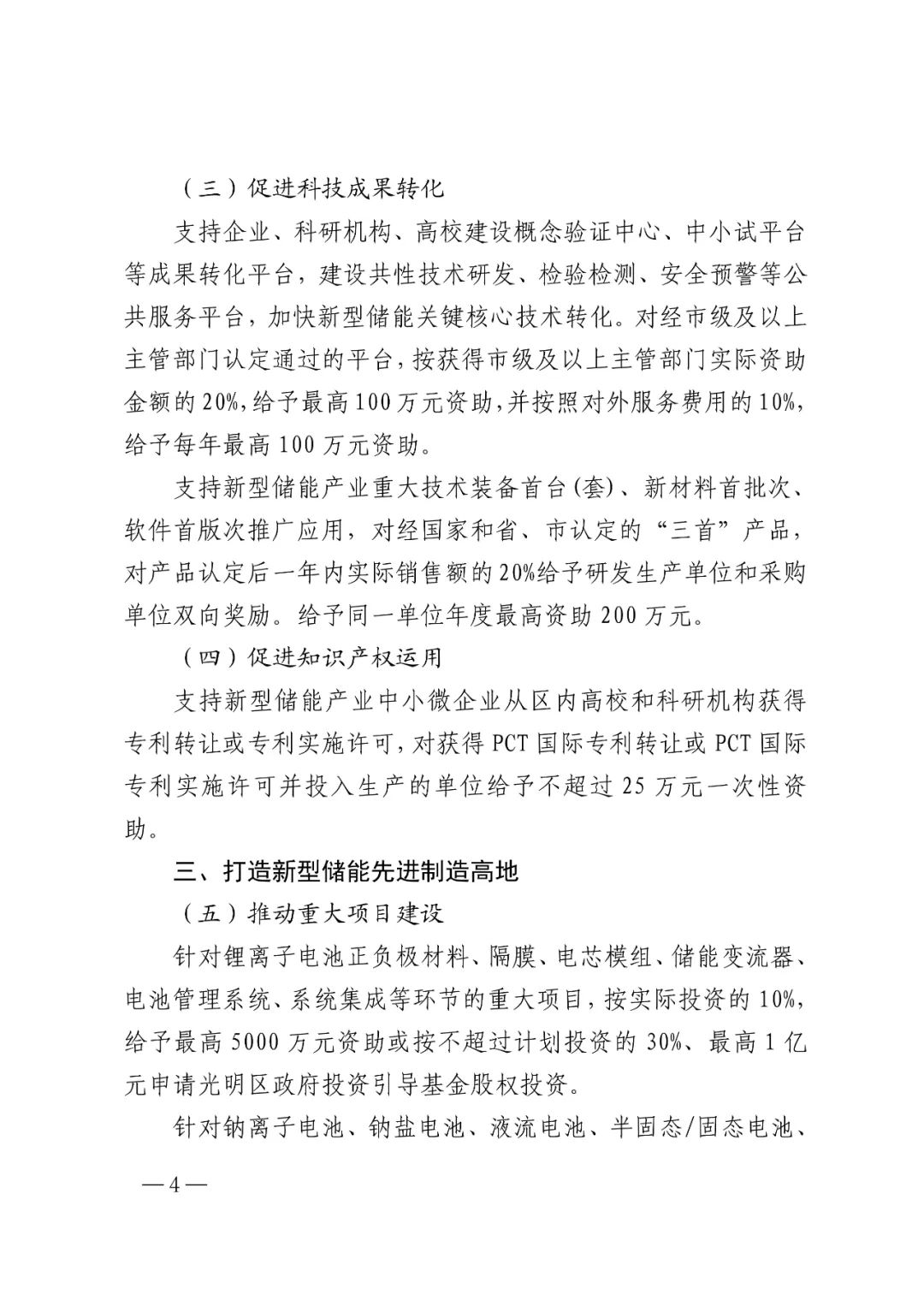 针对锂离子电池正负极材料、隔膜、电芯模组、储能变流器、电池管理系统、系统集成等环节的重大项目,按实际投资的10%,给予最高5000万元资助或按不超过计划投资的30%、最高1亿元申请光明区政府投资引导基金股权投资。
