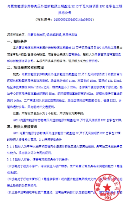 8月26日,内蒙古能源东苏特高压外送新能源三期基地32万千瓦风储项目EPC总承包工程招标公告发布,项目招标人为内蒙古能源集团旗下的内蒙古苏尼特左旗温都尔新能源有限公司,项目位于内盟苏尼特左旗东南部。
