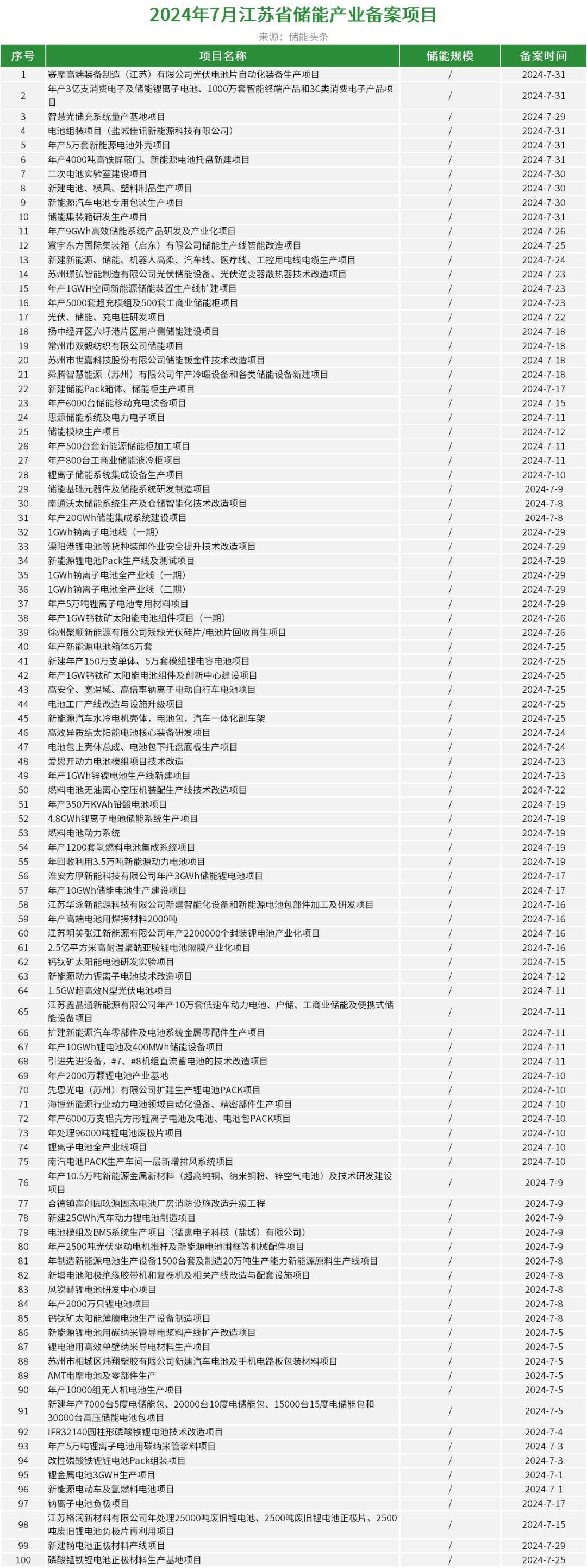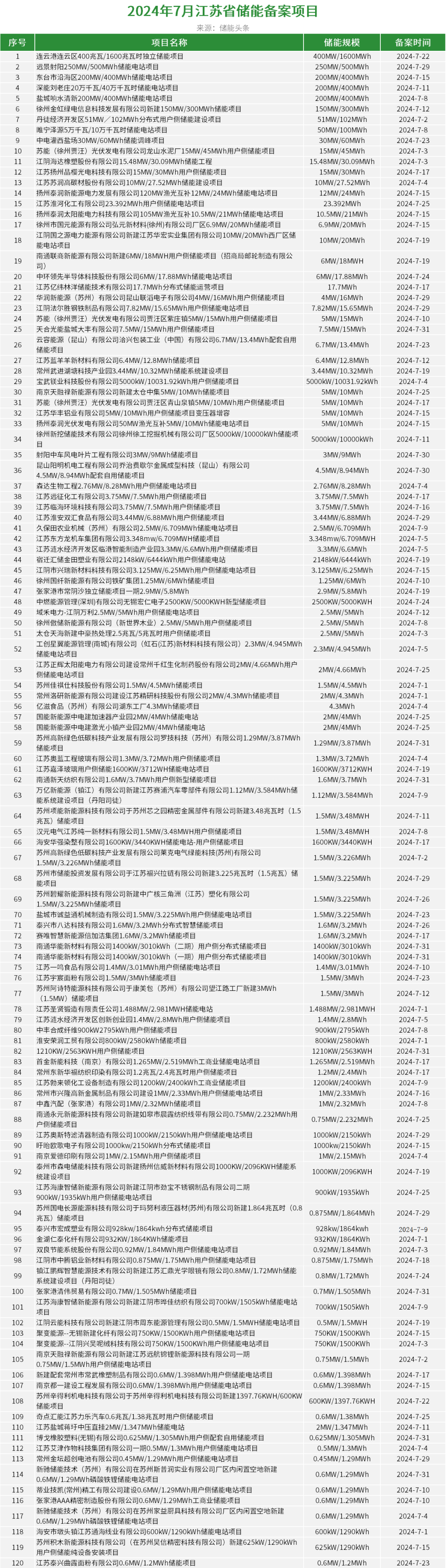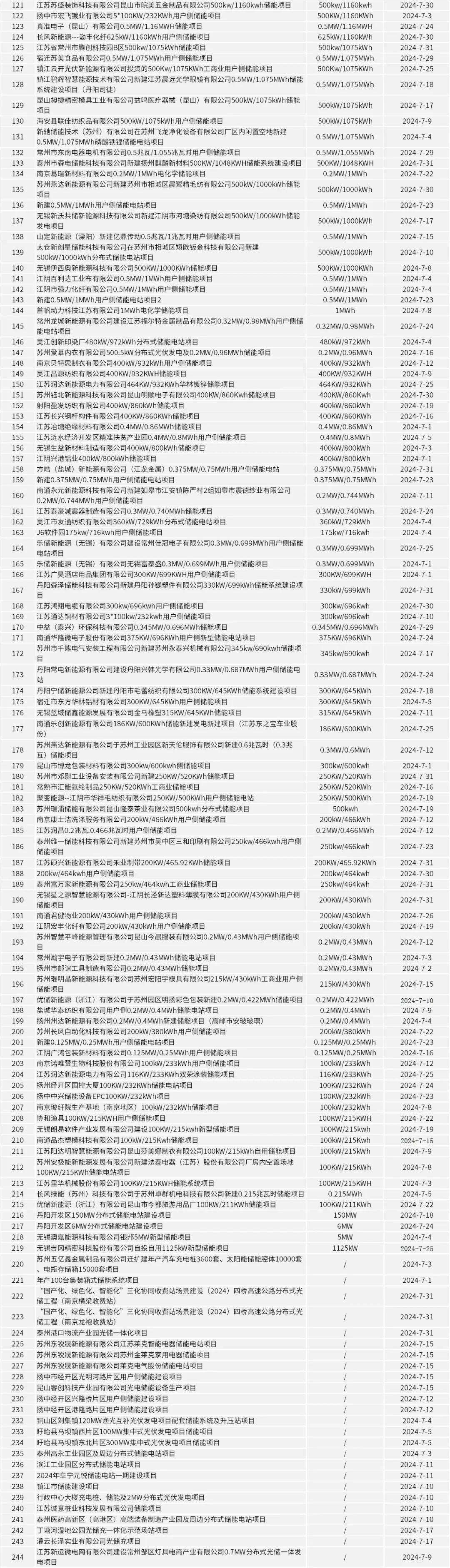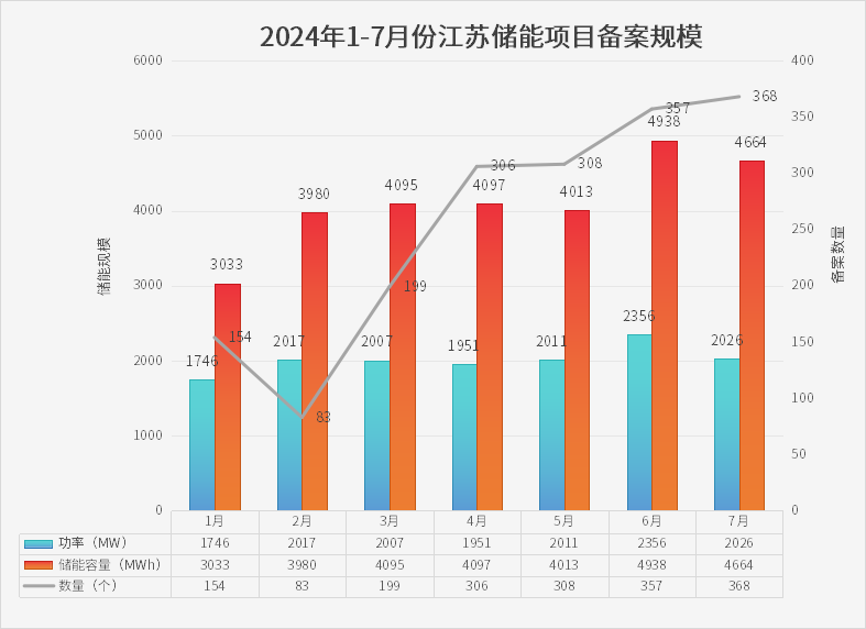 根据不完全统计,2024年7月江苏省共完成储能备案项目368个,规模合计2026MW/4664MWh,其中包括268个储能电站项目和100个储能产业项目。