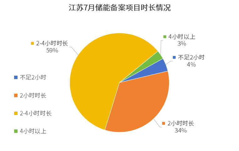 根据/不完全统计,7月份江苏省储能备案项目共368个,其中储能电站项目共268个,储能时长分布上,主要以2-4小时时长为主,占到59%;2小时储能占34%;不足2小时和4小时以上的占比较少,分别是4%和3%。