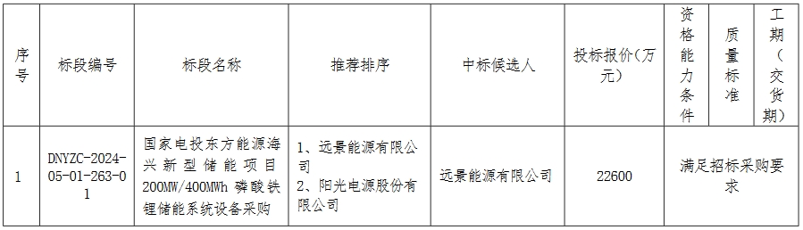 储能系统第一中标候选人为远景能源有限公司,投标报价22600万元,折合单价0.565元/Wh;