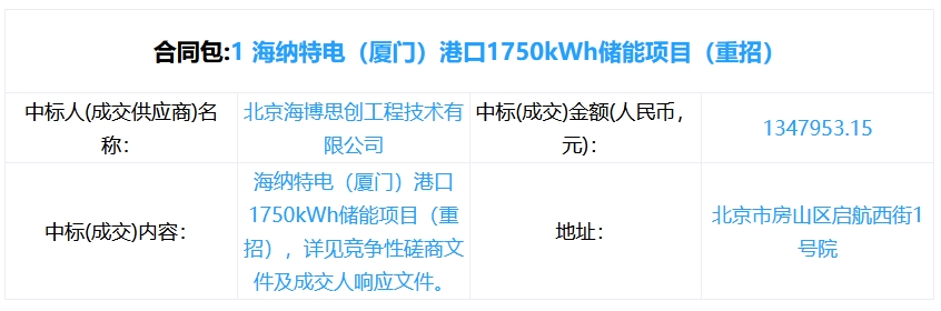 海纳特电【2024】12号海纳特电(厦门)港口1750kWh储能项目(重招)成交结果公示