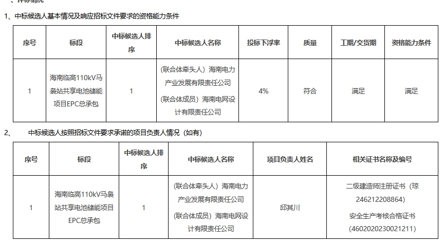 9月5日,南网储能科技公司海南临高110kV马袅站共享电池储能项目EPC总承包招标项目中标候选人公示,海南电力产业发展有限责任公司、海南电网设计有限责任公司预中标该项目,投标报价下浮4%。