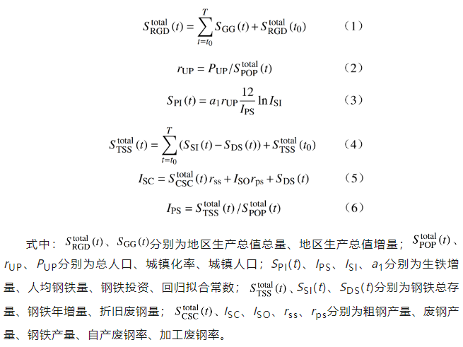 1)钢铁总存量。地区经济投入和人口发展情况会影响城镇化进程,炼铁作为钢铁生产的初始环节,与钢铁总存量的变化密不可分,主要方程式如下。