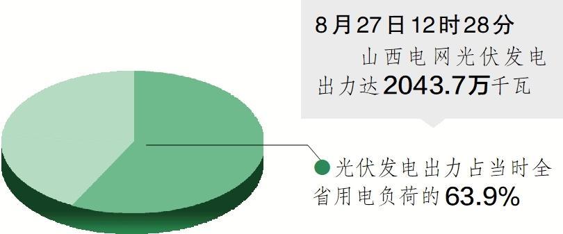 据电力家了解到,8月27日12时28分,山西电网光伏发电出力首次超过2000万千瓦,达2043.7万千瓦,创历史新高,光伏发电出力占当时全省用电负荷的63.9%。