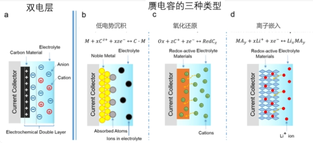 图4 超级电容器的双电层原理与三种常见赝电容类型
