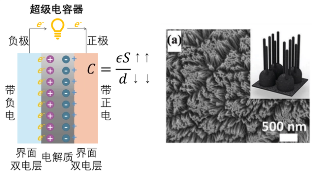 图3 左图为超级电容器结构示意图,图示为器件放电状态。右图为一类增加电极比表面积的方法