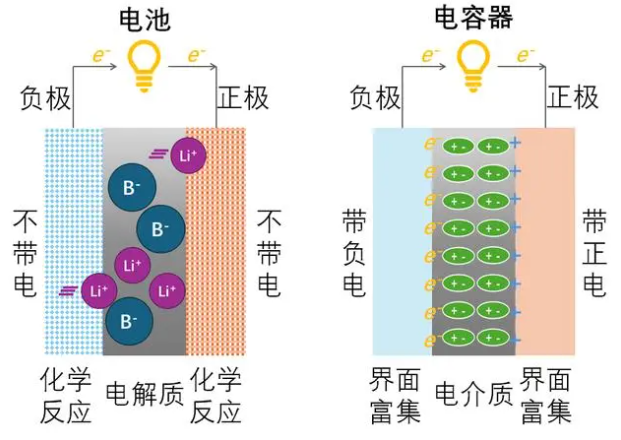 当我们对比电池与电容器的储电原理,就可以发现由二者原理决定的各自特点:电池储电量大,放电平台稳,放置时间长,但充/放电速度慢;电容器储电量小,放电平台不稳,放置时间短,但充/放电速度快。