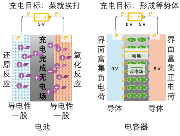 如前面所言,电池利用化学反应储存能量,存得多但慢;电容器利用物理原理储存电荷,存得快但少,那可否综合二者的特点,发展又快又好的电能储存装置呢?