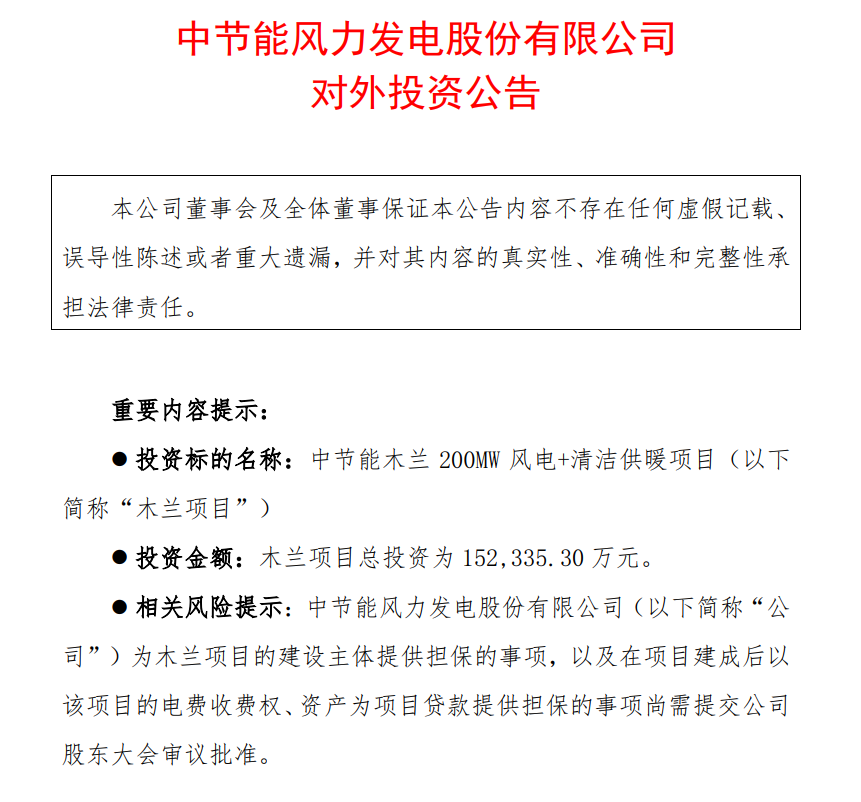 公告披露,节能风电于2024年9月6日召开第五届董事会第二十八次会议审议通过《关于投资建设中节能木兰200MW风电+清洁供暖项目的议案》,同意投资建设中节能木兰200MW风电+清洁供暖项目(以下简称木兰项目),项目总投资为152,335.30万元,同意公司全资子公司中节能黑龙江风力发电有限公司(下称黑龙江公司)作为木兰项目的建设主体开展相关工作。