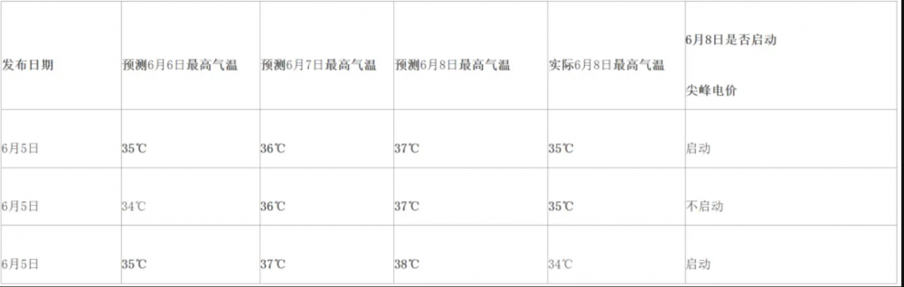 其它月份,连续三天最高气温≥35℃时启动尖峰电价。最高气温以四川省气象局每日20点发布的成都市未来三天天气预报为准,若未来三天预测最高气温均≥35℃,则第三天(无论当天气温是否大于等于35℃)执行尖峰电价。尖峰时段与7—8月相同,为13:00—14:00,21:00—23:00。