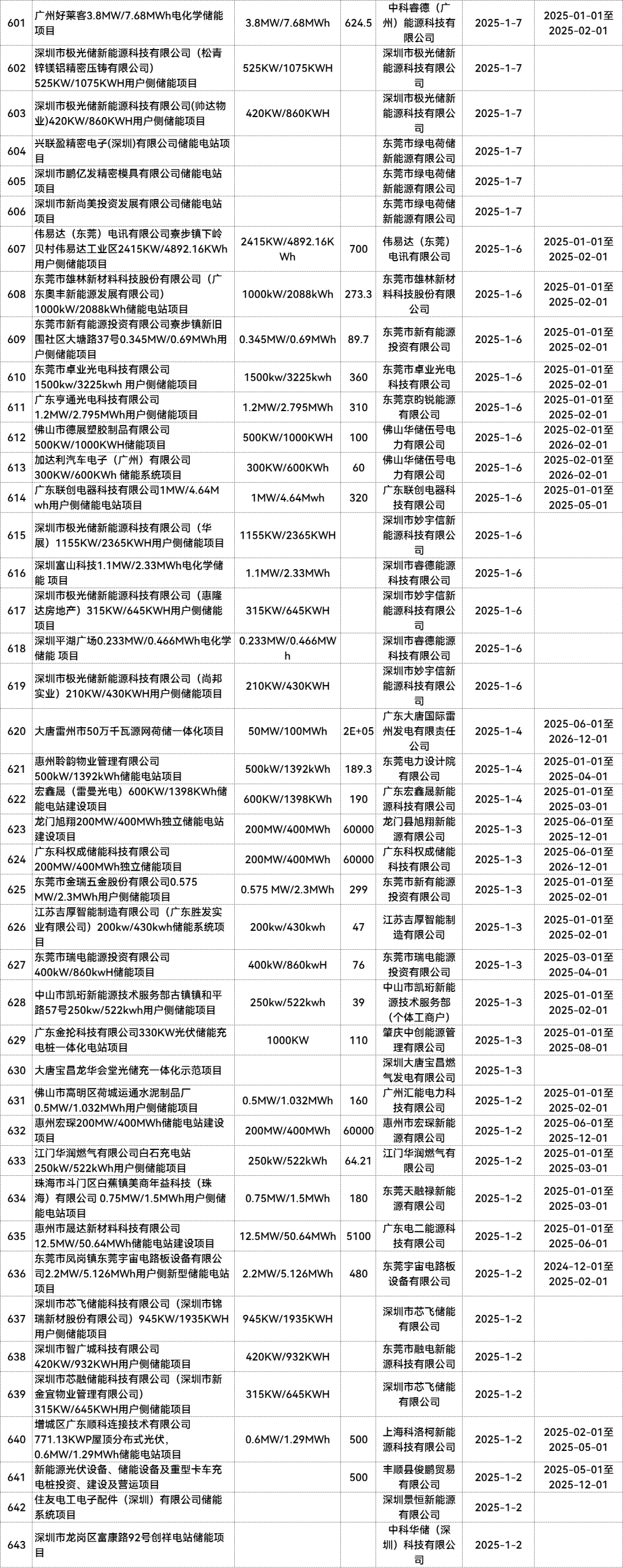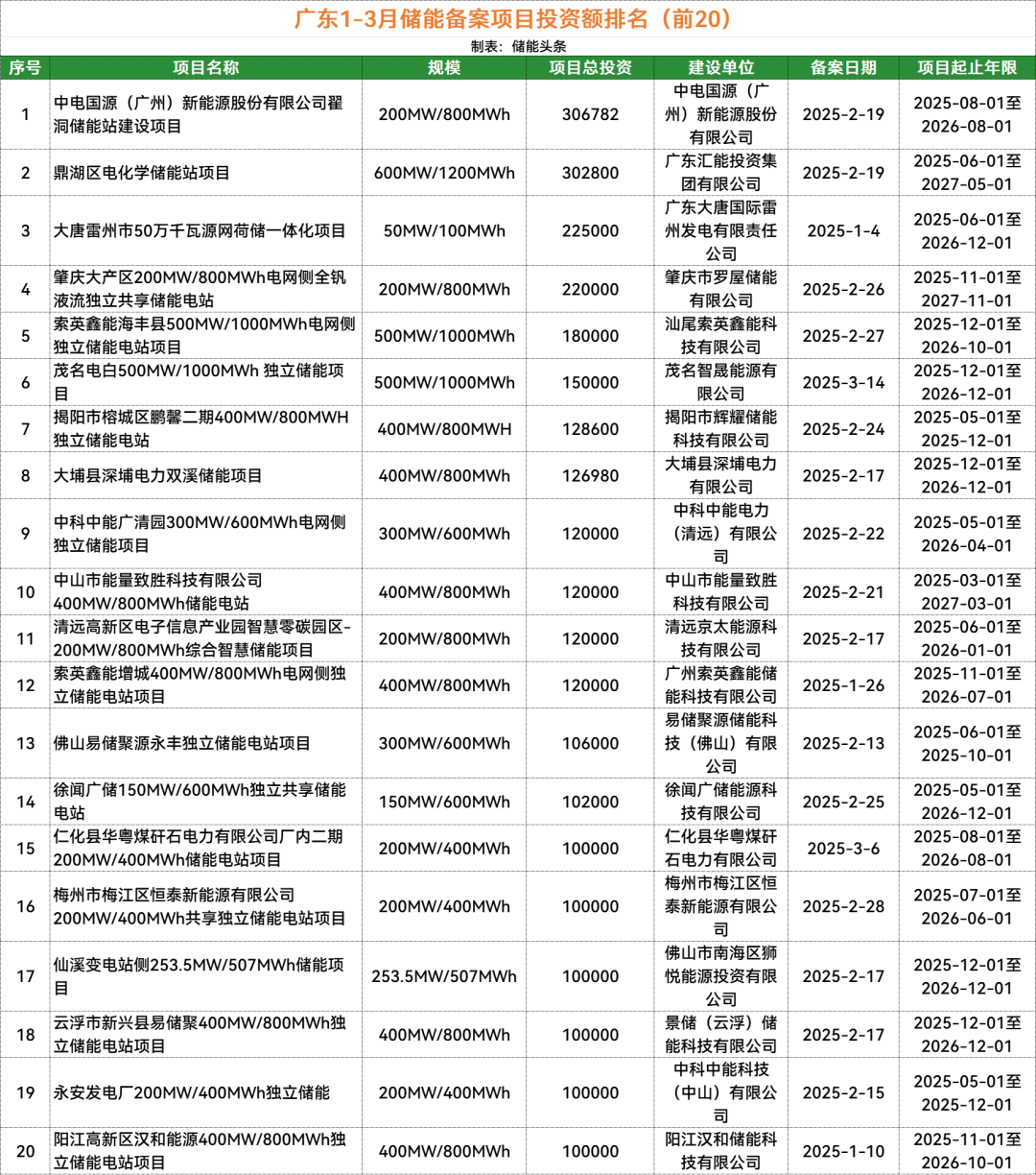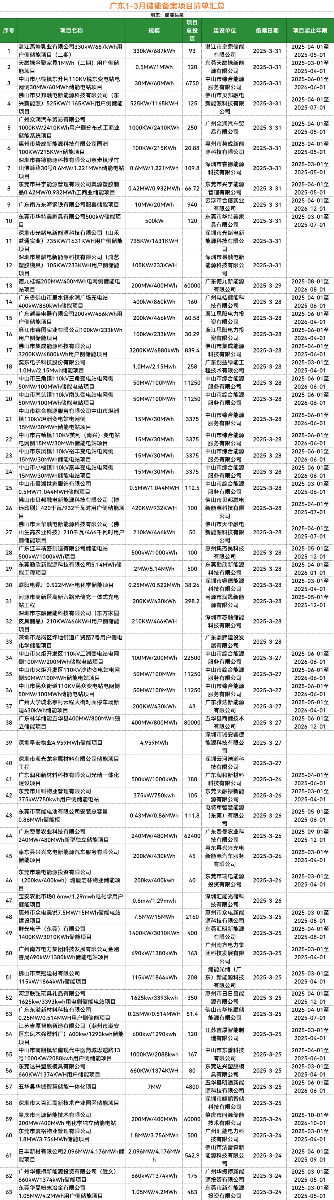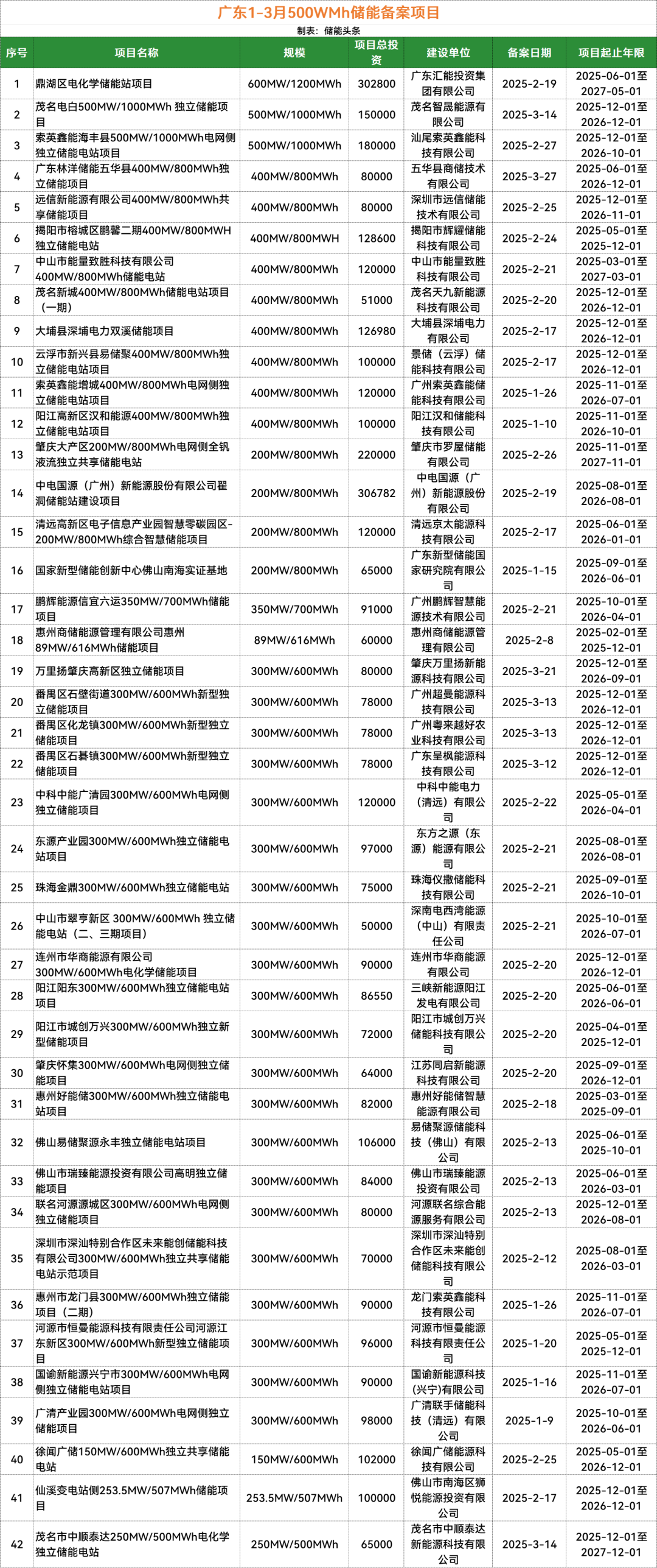 据公开数据不完全统计,2025年1-3月广东(包括深圳)完成储能项目备案643个,投资金额1061.93亿元,备案储能规模33.54GW/69.53GWh。