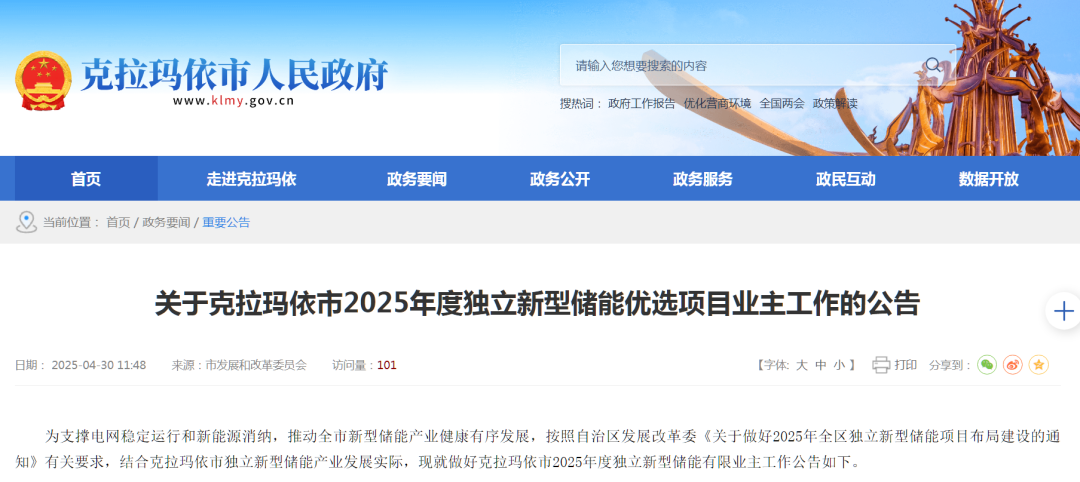 获悉,4月30日,新疆克拉玛依市发展和改革委员会发布《关于克拉玛依市2025年度独立新型储能优选项目业主工作的公告》。