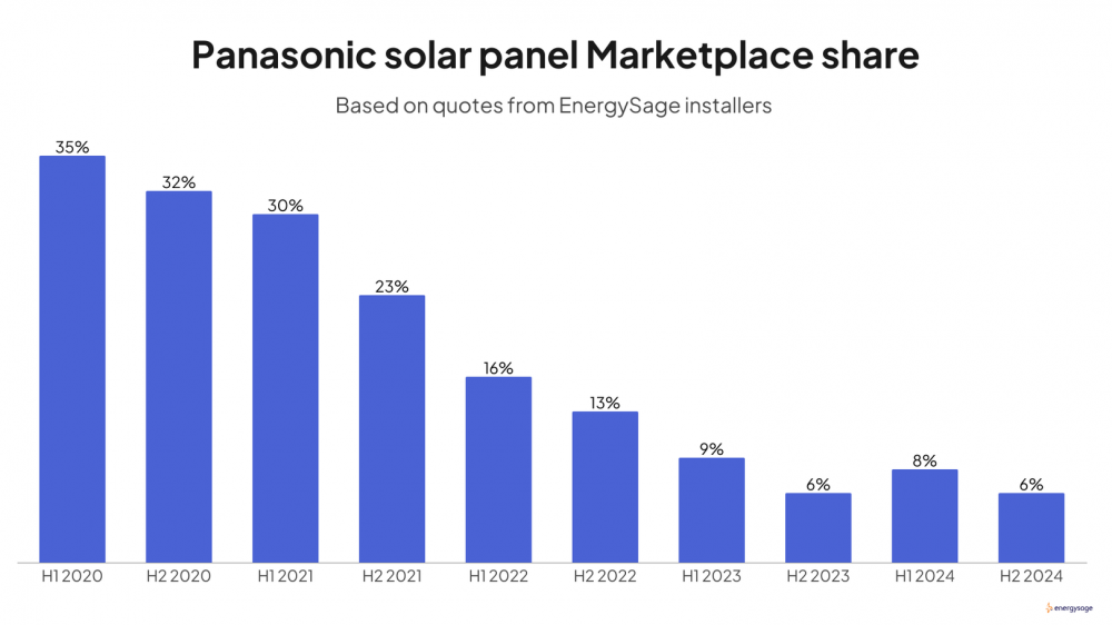 EnergySage的《2025年太阳能和储能市场报告》显示,从2021年到2024年,松下的电池和太阳能市场份额整体下降。松下EverVolt曾经是全美市场上报价最高、选择最多的太阳能系统,但到2024年,它已不再是各州市场份额最高的太阳能电池板。数据显示,短短四年内,松下的太阳能电池板市场份额从35%下降到6%,而其电池市场份额则从7%下降到1%。