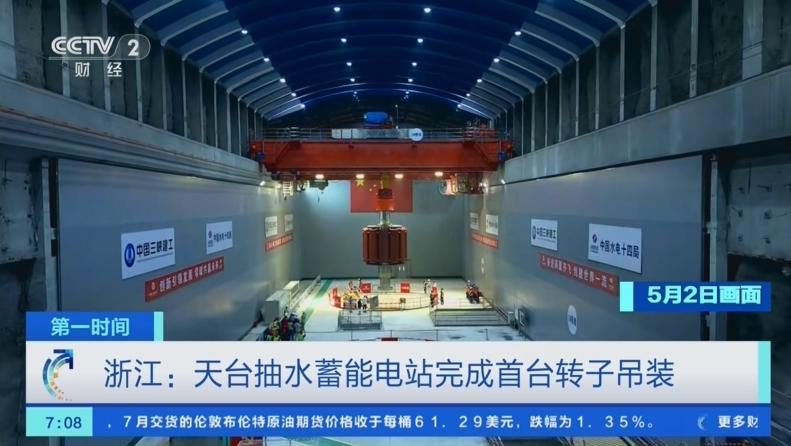 5月2日,浙江天台抽水蓄能电站1号机组顺利完成转子吊装,标志着目前我国首台单机容量最大抽水蓄能机组正式进入总装阶段。