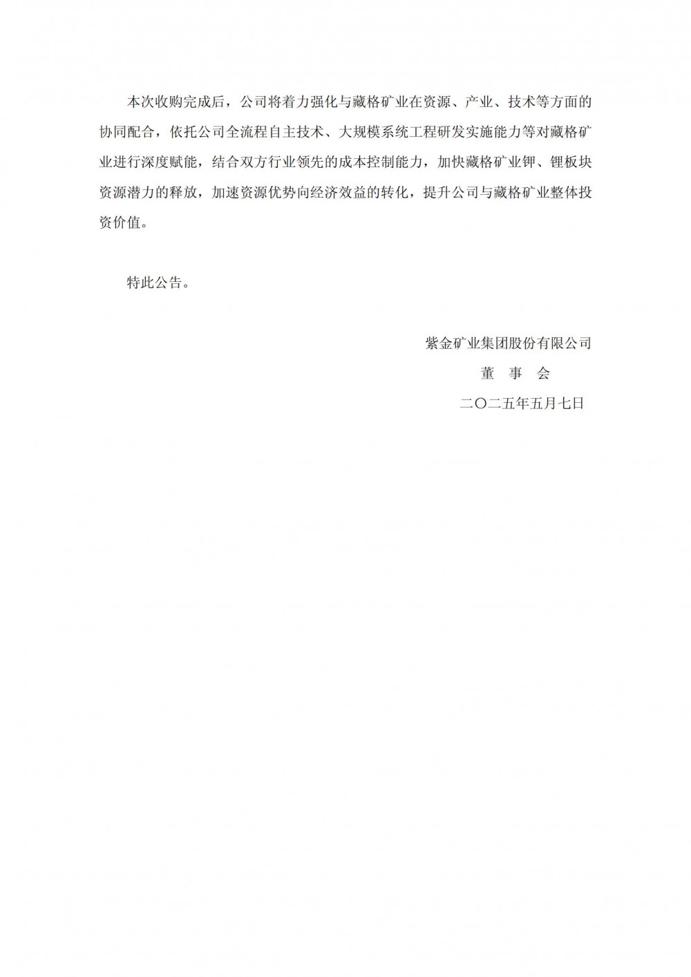 紫金矿业表示,本次收购完成后,公司将着力强化与藏格矿业在资源、产业、技术等方面的协同配合,依托公司全流程自主技术、大规模系统工程研发实施能力等对藏格矿业进行深度赋能,结合双方行业领先的成本控制能力,加快藏格矿业钾、锂板块资源潜力的释放,加速资源优势向经济效益的转化,提升公司与藏格矿业整体投资价值。