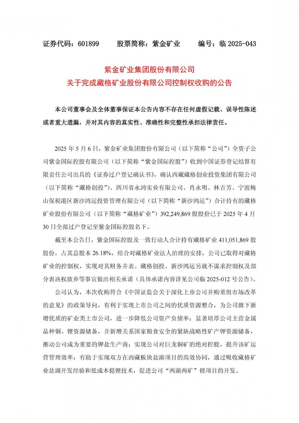 5月6日,紫金矿业发布公告称,公司全资子公司紫金国际控股有限公司收到中国证券登记结算有限责任公司出具的《证券过户登记确认书》,确认西藏藏格创业投资集团有限公司、四川省永鸿实业有限公司、肖永明、林吉芳、宁波梅山保税港区新沙鸿运投资管理有限公司合计持有的藏格矿业股份有限公司392,249,869股股份已于2025年4月30日全部过户登记至紫金国际控股名下。