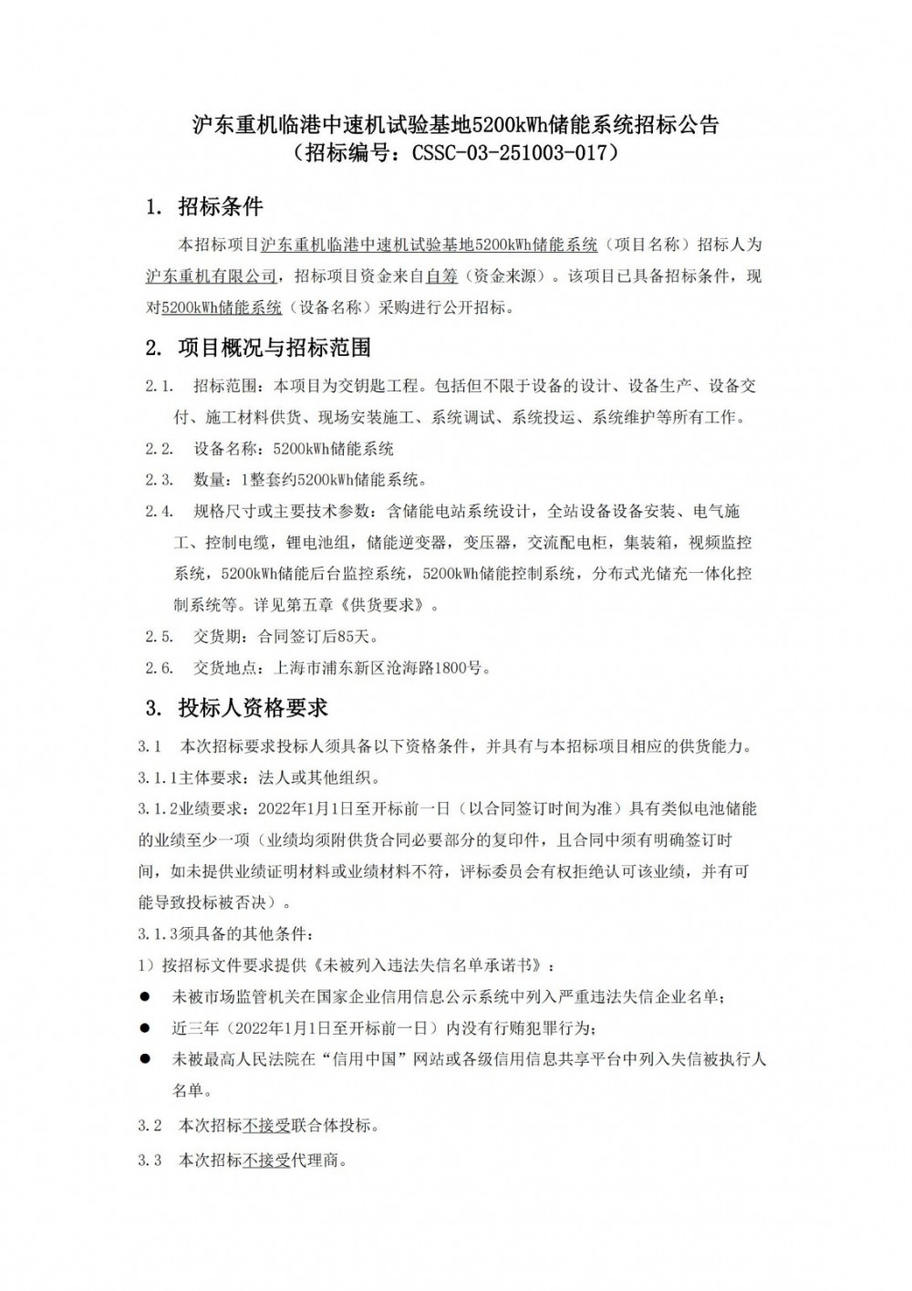 5月13日,沪东重机临港中速机试验基地5200kWh储能系统招标公告发布。