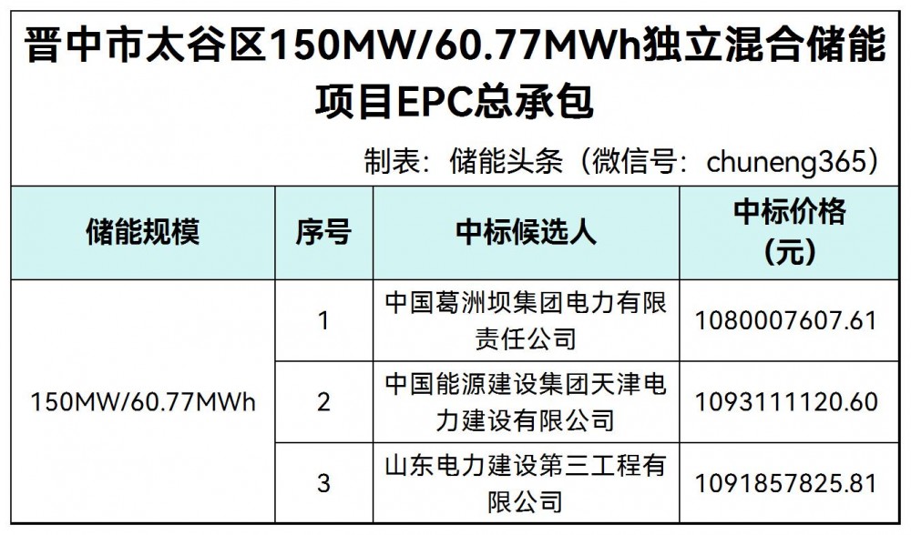晋中市太谷区150MW/60.77MWh独立混合储能项目EPC总承包.(招标项目编号:I1400005446000082002),经评标委员会评审,确定001 晋中市太谷区150MW/60.77MWh 独立混合储能项目EPC总承包的中标候选人,现公示如下: