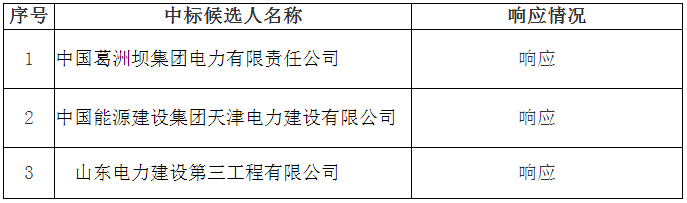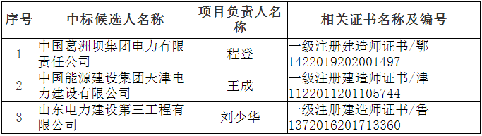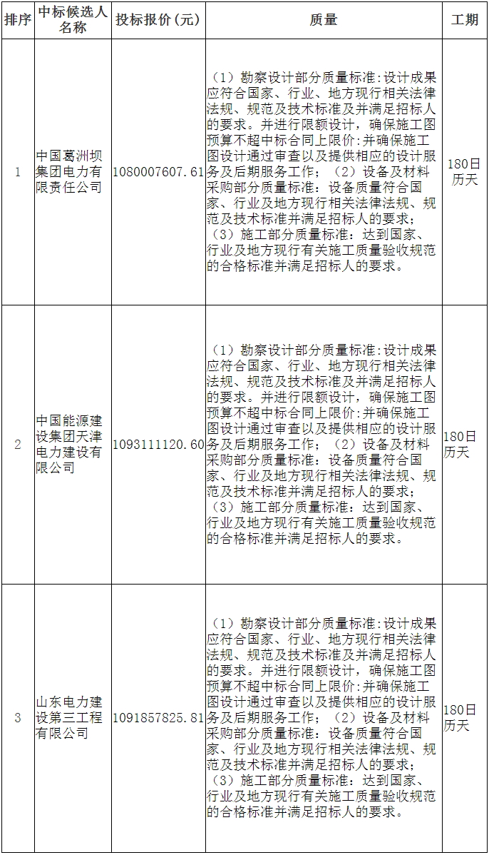 第一中标候选人为中国葛洲坝集团电力有限责任公司,投标报价1080007607.61元;第二中标候选人为中国能源建设集团天津电力建设有限公司,投标报价1093111120.6元;第三中标候选人为山东电力建设第三工程有限公司,投标报价1091857825.81元。