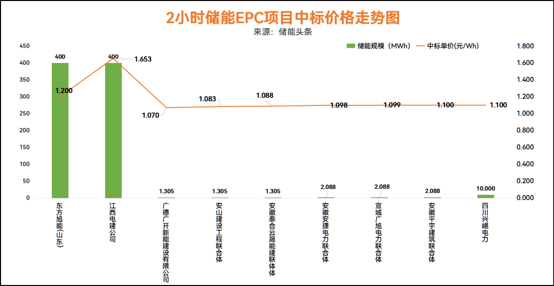 2小时EPC最低价为1.070元/Wh,由广德广开新能建设有限公司在广德金泰利金属科技有限公司0.625MW/1.305MWh储能电站项目EPC总承包工程中投出;最高价为1.653元/Wh,由中国电建集团江西省电力建设有限公司在申能新疆塔城和布克赛尔县200万千瓦光伏项目220kV升压汇集站及储能工程PC总承包中报出。