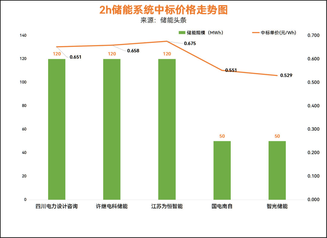 储能系统采购投标单价最高的项目是江苏为恒智能科技有限公司在60MW/120MWh天原工业储能项目储能系统中报出,折算单价0.675元/Wh。