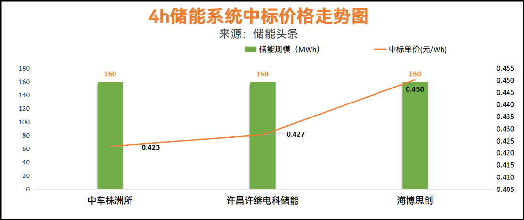 4小时储能系统:一个项目的中的3个有效报价,报价在0.423~0.450元/Wh之间,均价为0.433元/Wh。