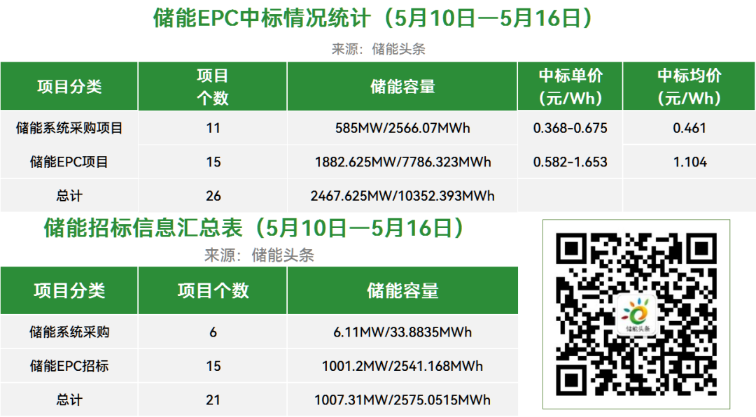据对近期(5月10日-5月16日)储能系统与EPC招中标公开项目进行统计与分析。