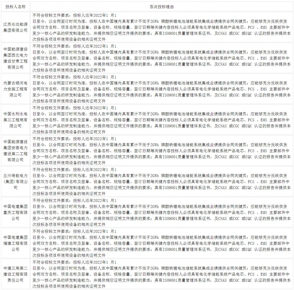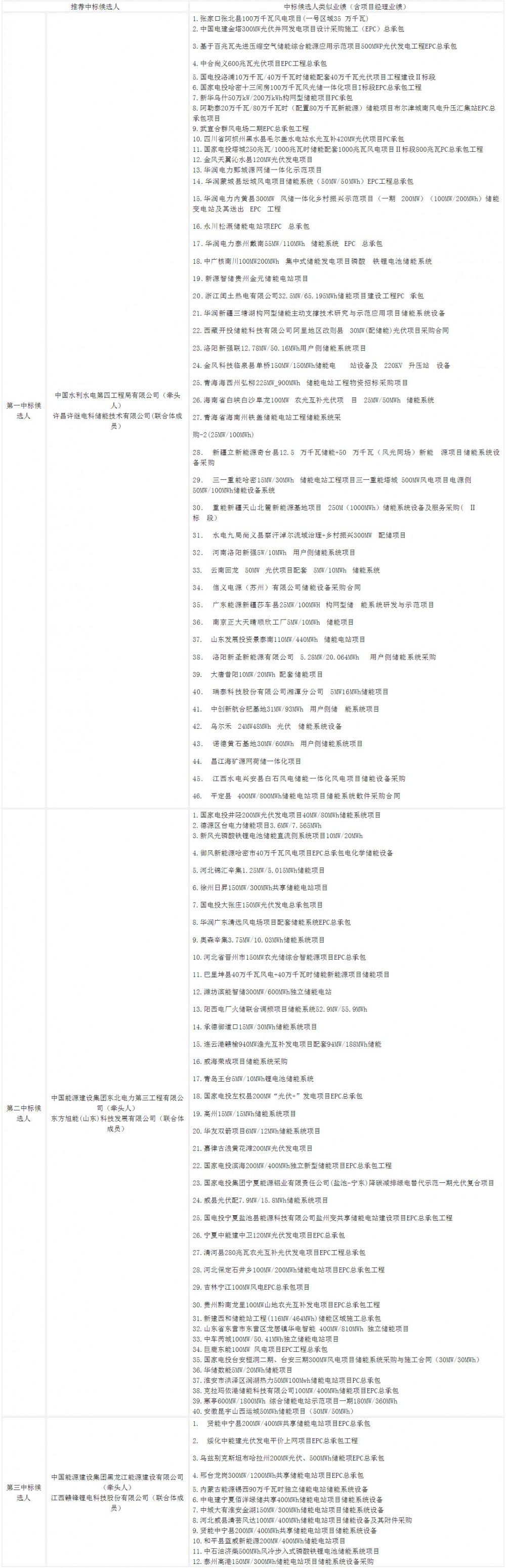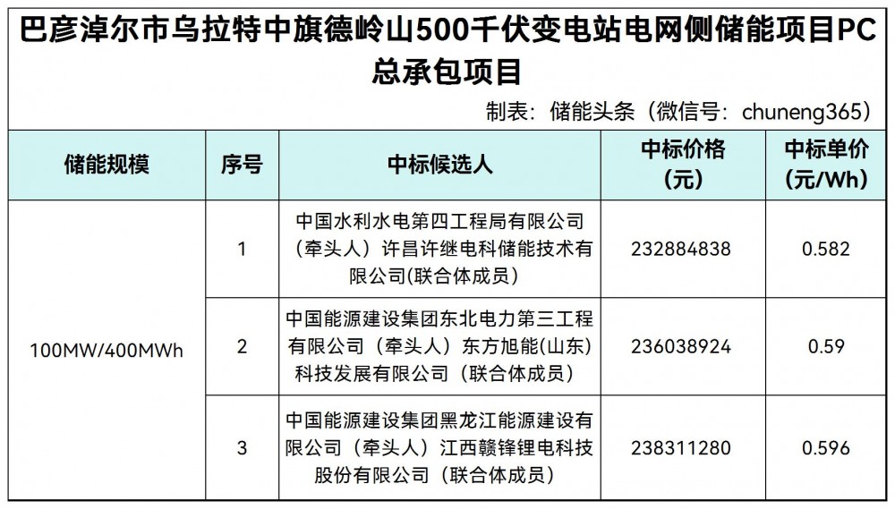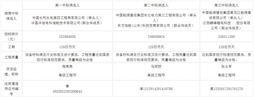 第一中标候选人为中国水利水电第四工程局有限公司、许昌许继电科储能技术有限公司,投标报价23288.4838万元,折合单价0.582元/Wh;第二中标候选人为中国能源建设集团东北电力第三工程有限公司、东方旭能(山东)科技发展有限公司,投标报价23603.8924万元,折合单价0.590元/Wh;第三中国能源建设集团黑龙江能源建设有限公司、江西赣锋锂电科技股份有限公司,投标报价23831.1280万元,折合单价0.596元/Wh。