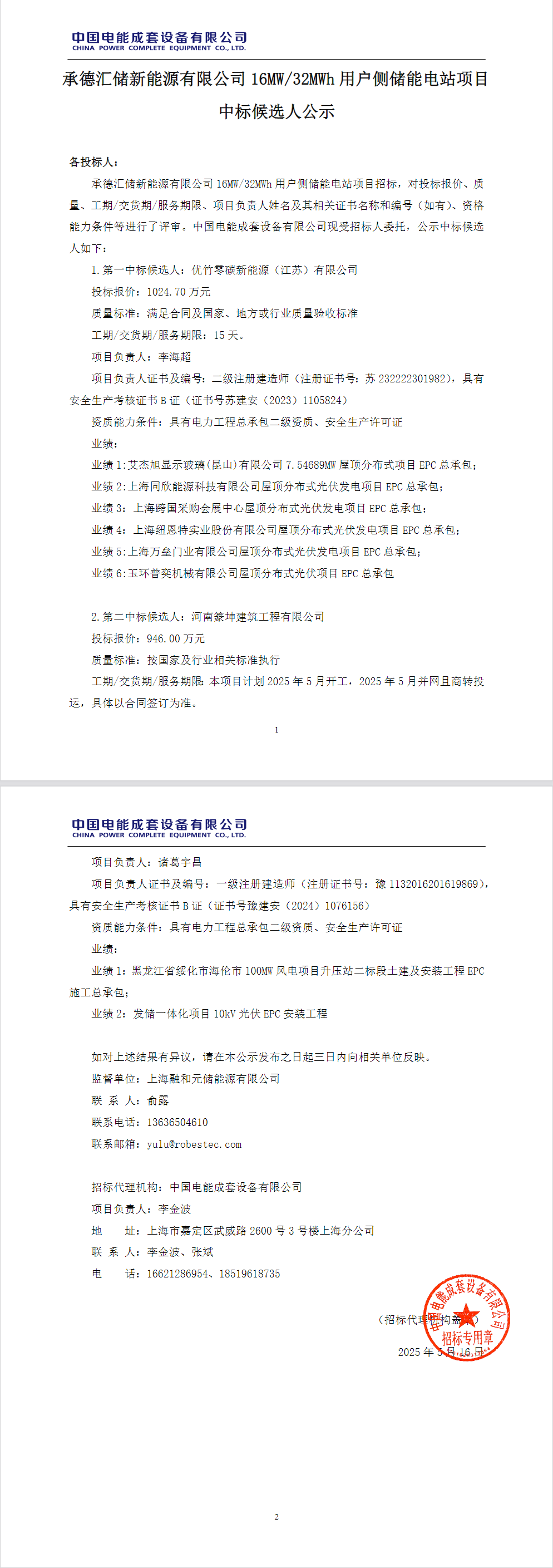 近日,承德汇储新能源有限公司16MW/32MWh用户侧储能电站项目中标侯选人公示。