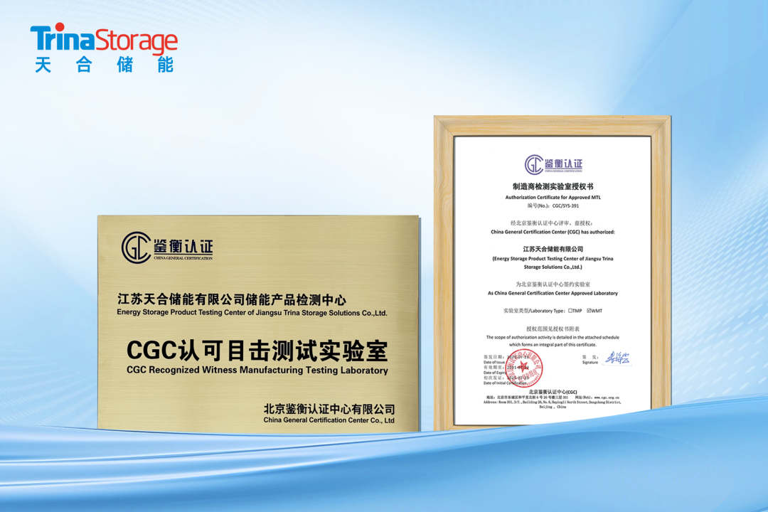 近日,天合储能正式获得北京鉴衡认证中心(CGC) 颁发的目击实验室资质。在北京鉴衡认证中心专家的现场审核下,公司自主研发的“储能专用天合芯及电池系统“,于常州AES先进储能技术研究院完成了一系列严格的性能与安全测试,充分展现了天合储能在检测能力、质量管控与研发实力等方面的领先优势。
