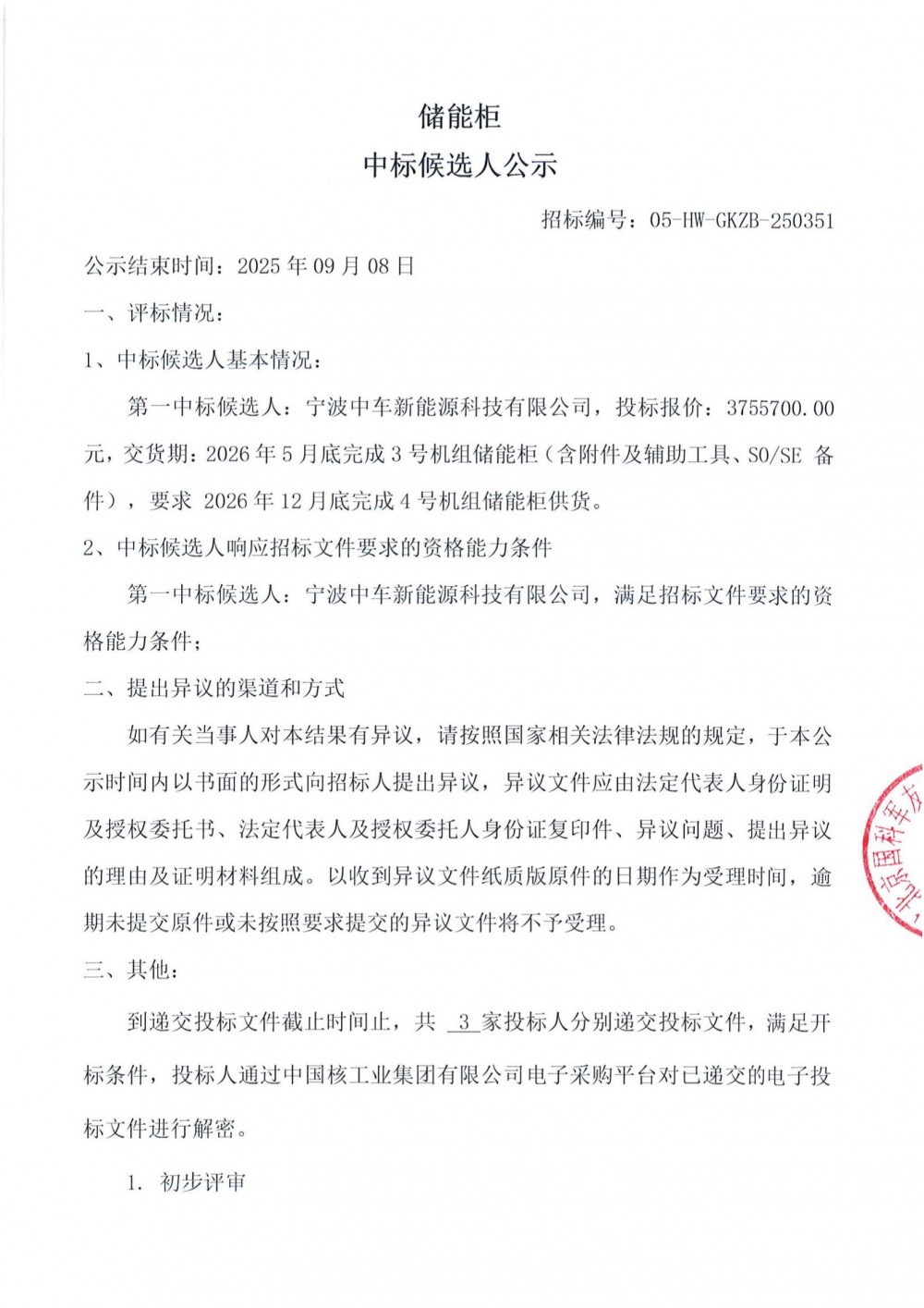 9月3日,中国核动力研究设计院发布储能柜中标候选人公示。