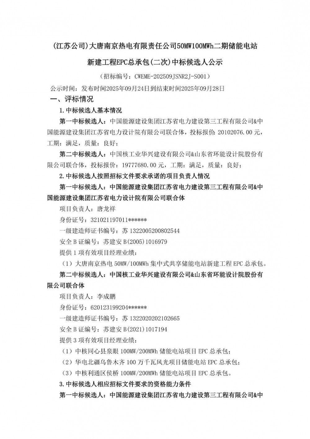 9月25日,大唐南京热电有限责任公司50MW100MWh二期储能电站新建工程EPC总承包中标候选人公示。