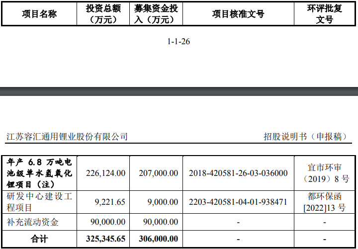 容汇锂业本次创业板IPO募投项目包括“年产6.8万吨电池级单水氢氧化锂项目”、“研发中心建设工程项目”及“补充流动资金”,拟募集资金30.6亿元。