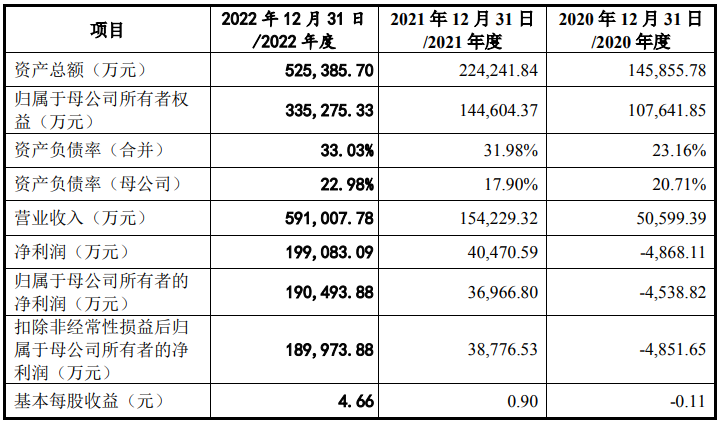 2020年度、2021年度、2022年度,容汇锂业营业收入分别为50,599.39万元、154,229.32万元和591,007.78万元;归母净利润分别为-4,538.82万元、36,966.80万元和190,493.88万元;扣非归母净利润分别为-4,851.65万元、38,776.53万元和189,973.88万元。