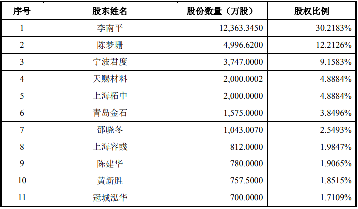 股东方面,容汇锂业控股股东和实际控制人为李南平、陈梦珊夫妇。截至招股说明书签署之日,夫妇二人合计持有公司17,359.9650万股股份,占公司发行前总股本的42.4309%。李南平现任公司董事长,陈梦珊现任公司副董事长、总经理。