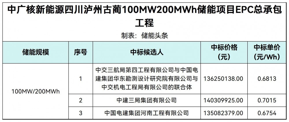 第一中标候选人为中交三航局第四工程有限公司与中国电建集团华东勘测设计研究院有限公司与中交机电工程局有限公司的联合体,投标报价136250138元,折合单价0.6813元/Wh;第二中标候选人为中建三局集团有限公司,投标报价140309925元,折合单价0.7015元/Wh;第二中标候选人为中国电建集团河南工程有限公司,投标报价135082379元,折合单价0.6754元/Wh。