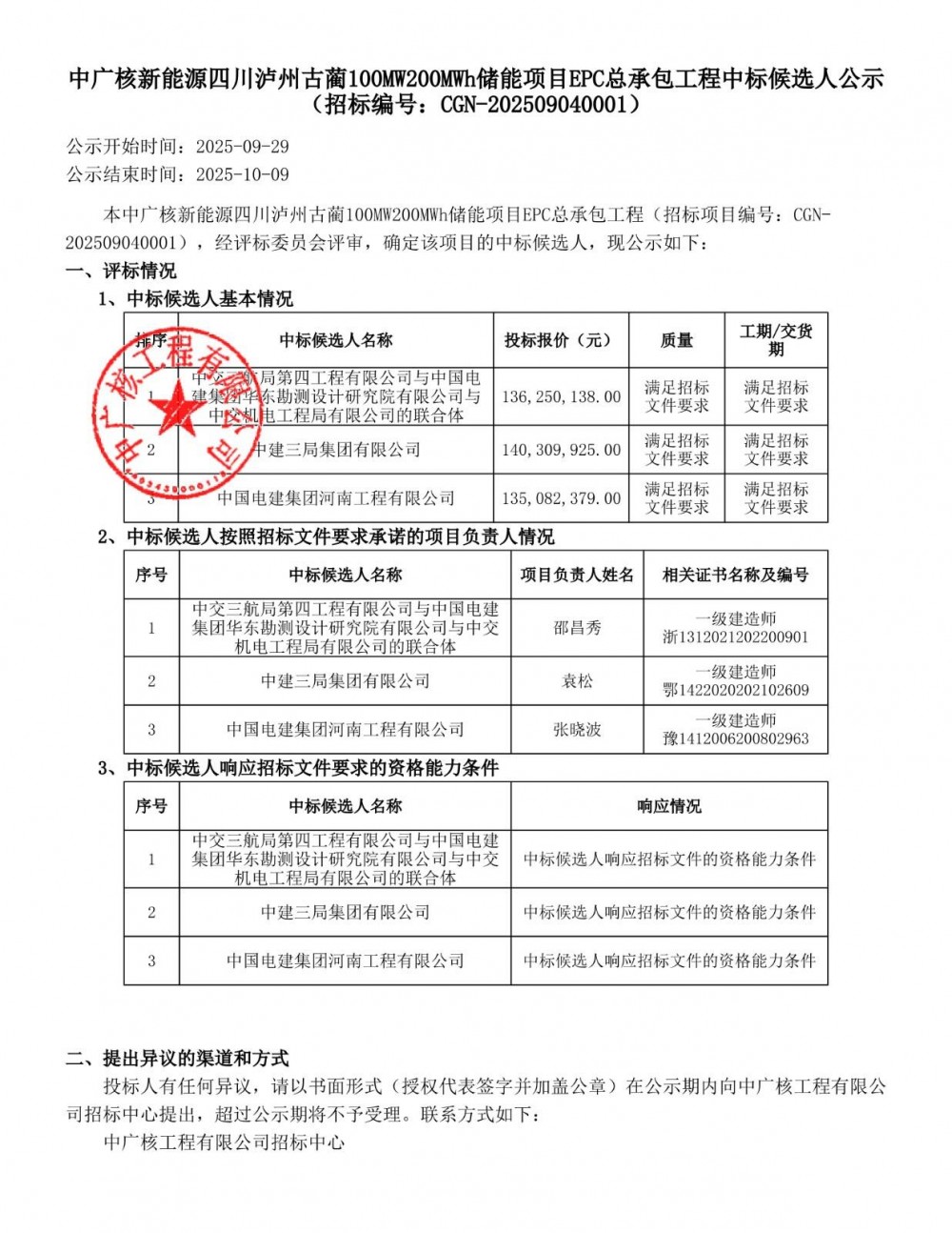 9月29日,中广核新能源四川泸州古蔺100MW200MWh储能项目EPC总承包工程中标候选人公示。