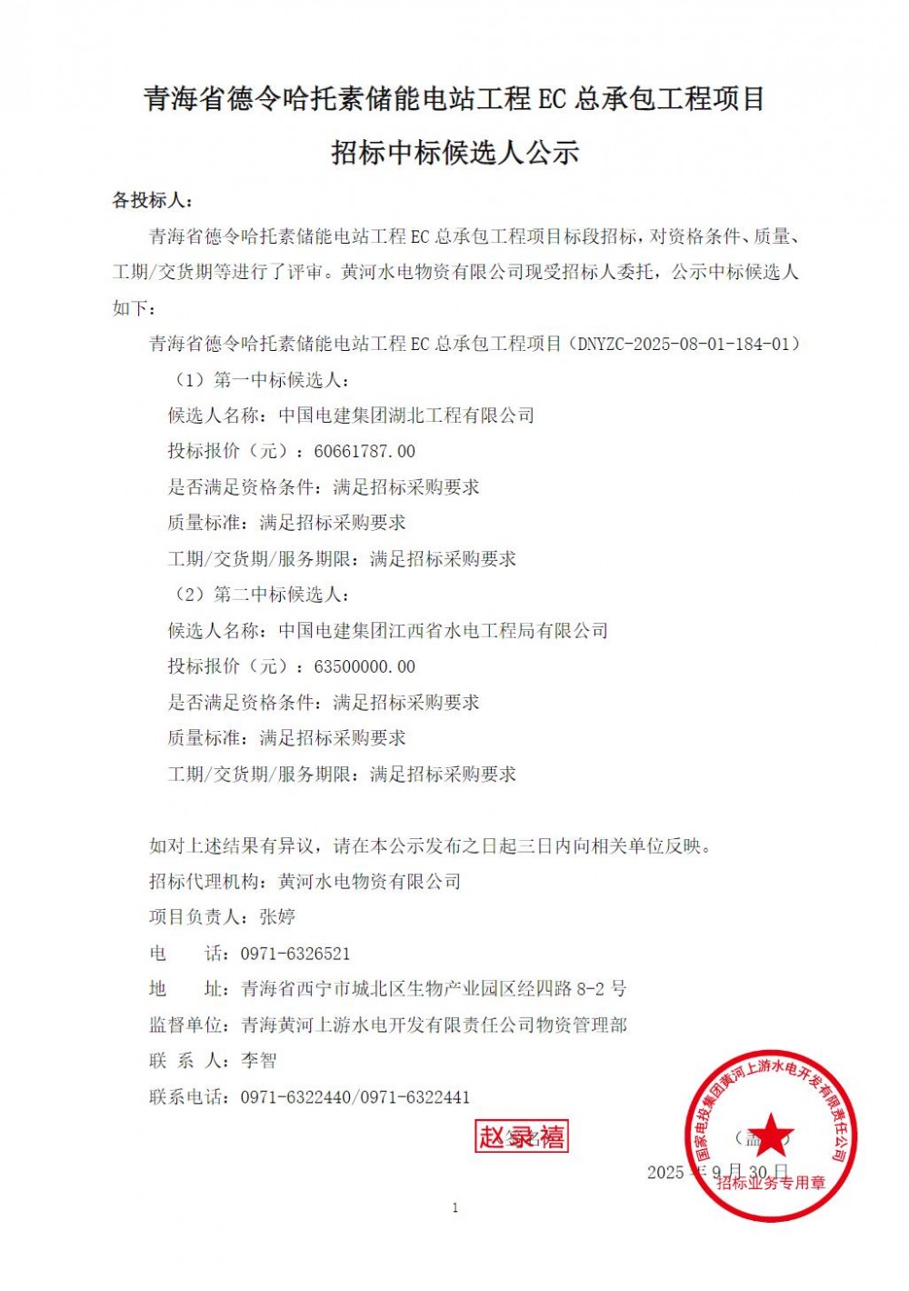 9月30日,青海省德令哈托素储能电站工程EC总承包工程(重新招标)招标中标候选人公示。
