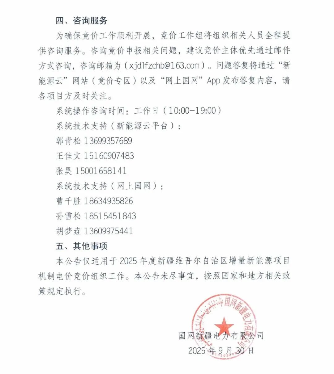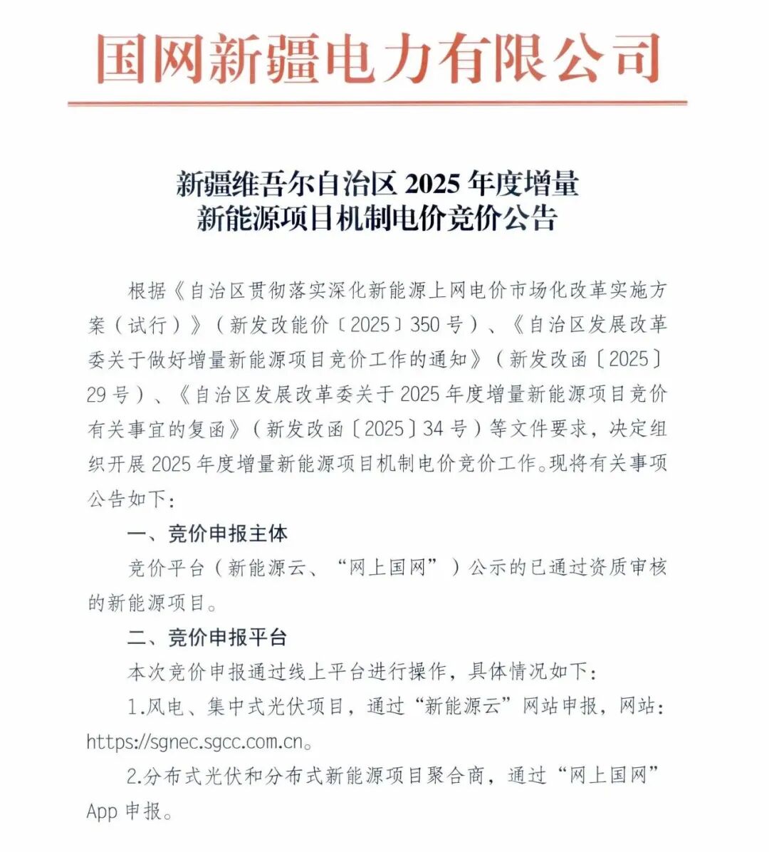 电力家获悉,9月30日,新疆维吾尔自治区2025年度增量新能源项目机制电价竞价公告。